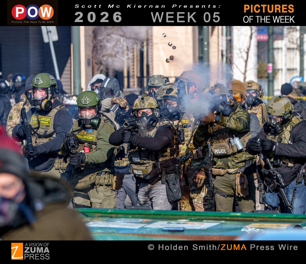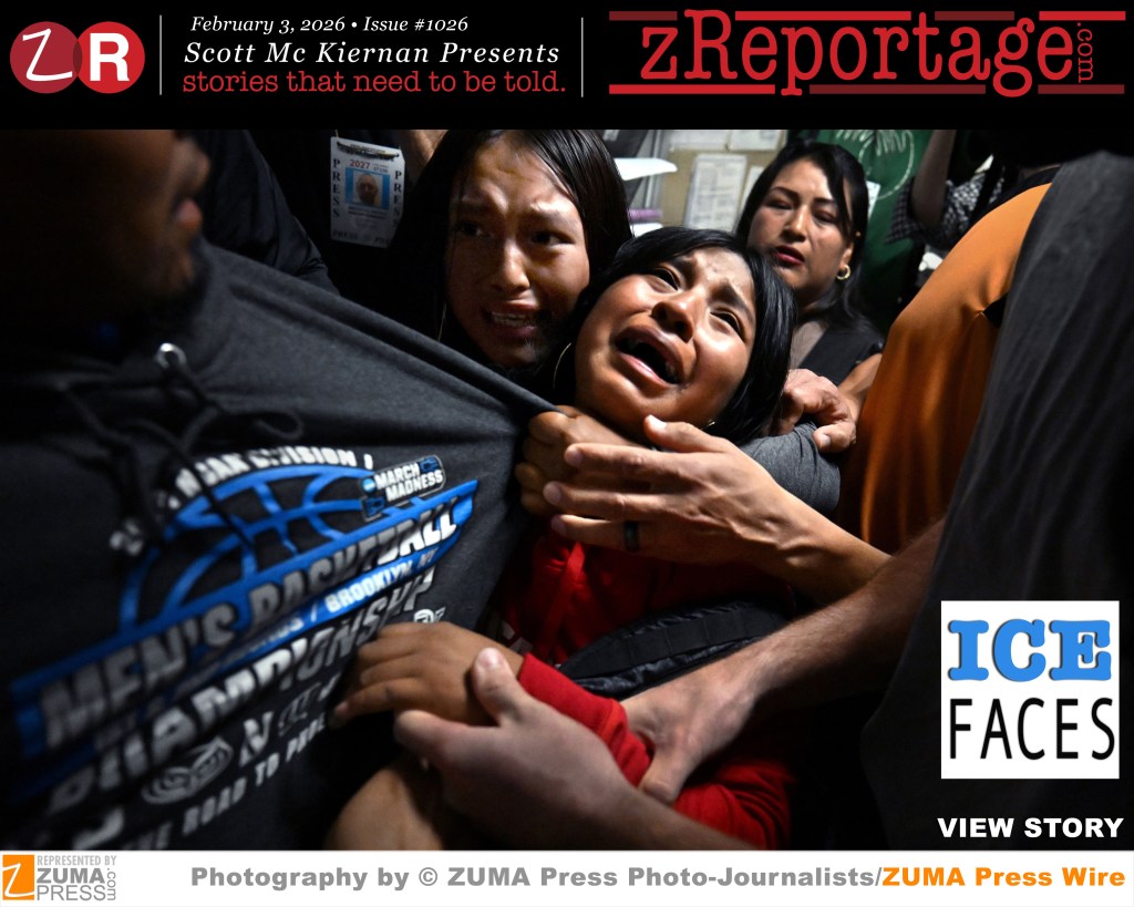 Scott Mc Kiernan Presents zReportage.com Issue #1026 Story of the Week: Published TUESDAY, February 3, 2026: ‘ICE FACES” Pictures by Award Winning ZUMA Press Photo-Journalists: A year into his second term, President Trump’s pledge to stage the ‘largest deportation operation in American history’ targeting the more than 10 million unauthorized migrants living in the US has already made an indelible mark on the nation. The focus of Operation Metro Surge, as the Trump administration has branded this latest immigration effort in the Twin City area, also sees confrontations with anti-ICE protesters. The fatal shootings of Renee Good and Alex Pretti by federal agents in Minneapolis have significantly heightened tensions in the United States, acting as a national tipping point in a deeply divided political landscape. In New York migrants line up in the lobby of the Jacob Javits Federal building in while masked ICE agents in balaclavas stand outside courtrooms with papers bearing photos of their ‘target’ and detain people during this administration’s controversial immigration reform policies. Welcome to ‘ICE FACES’