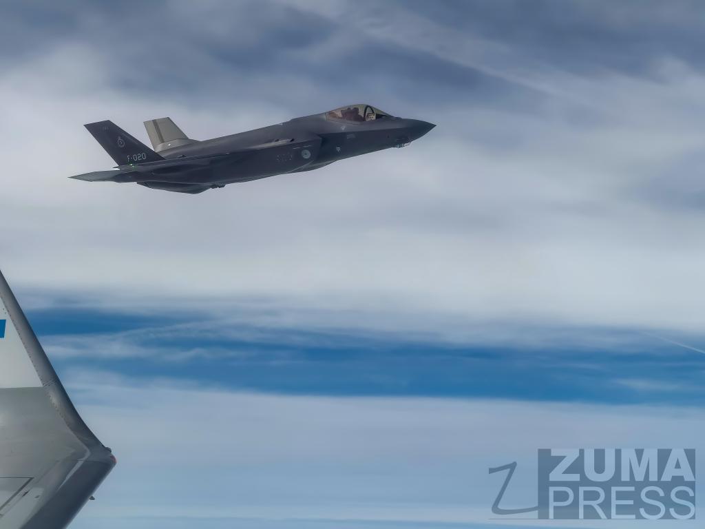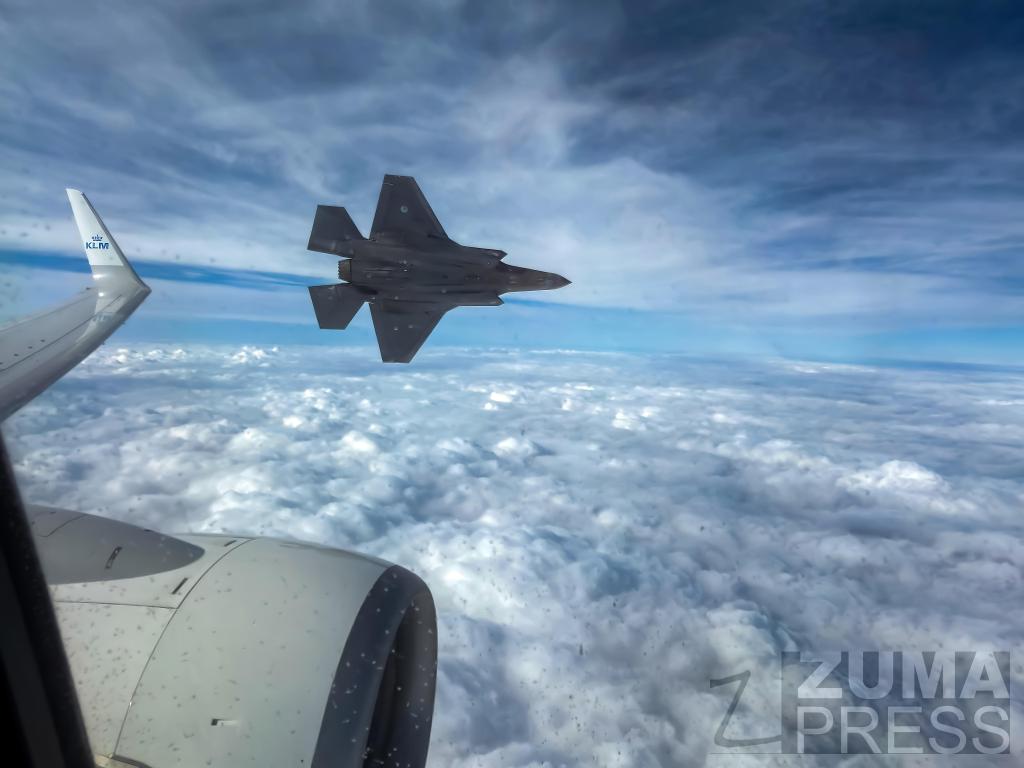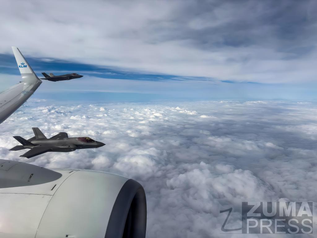 An F-35 escorts a KLM flight carrying Team Netherlands home from the Milano Cortina 2026 Winter Olympics, saluting athletes as the jet honors their achievements while entering Dutch airspace.