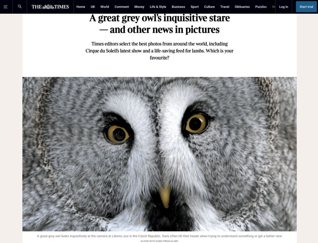 January 22, 2026, Liberec, Czech Republic: A Great Gray Owl (Strix nebulosa) tilts its head curiously while posing for the photographer in its aviary at Zoo Liberec in the Czech Republic. Owls often tilt their heads when trying to understand something or get a better view. Adult Great Gray Owls have a large rounded head with a gray face and yellow eyes with darker circles around them. (Credit Image: © Slavek Ruta/ZUMA Press Wire)