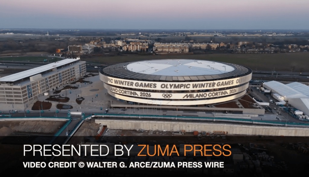 Aerial view of Milano Santagiulia Ice Hockey Arena, which hosts ice hockey for the 2026 Milano Cortina Winter Olympics in Milan, Italy.