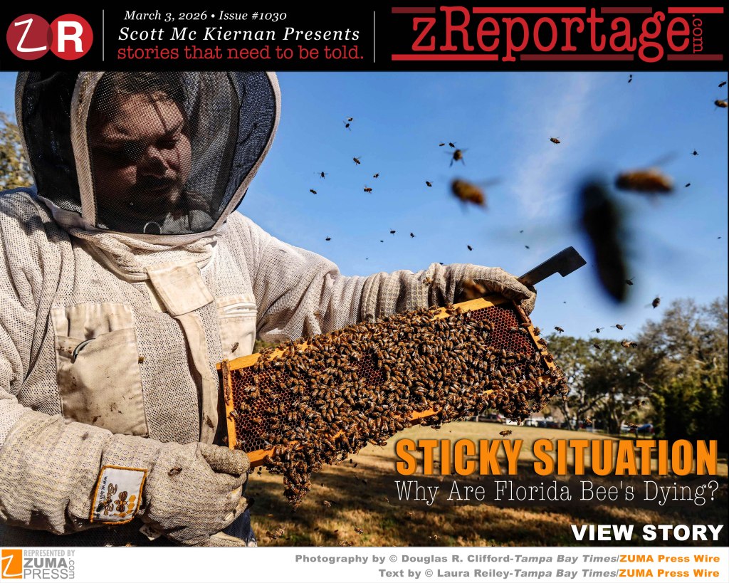 Scott Mc Kiernan Presents zReportage.com Issue #1030 Story of the Week: Published TUESDAY March 3, 2026: ‘STICKY SITUATION: Why Are Florida Bee’s Dying?’ Photography by ZUMA Partner newspaper The Tampa Bay Times Pulitzer Prize winning photo-journalist Douglas R. Clifford: Scientists call it a ‘pollinator health crisis.’ One in three mouthfuls of everything we eat directly or indirectly rely upon honeybee production, according to the U.S. Department of Agriculture. Pollinators contribute over $24 billion to the US economy, $15 billion from bees alone. But domestic pollinators have plummeted for decades, especially native bees. Managed honey bees fell from 6 million colonies in 1947 to 2.5 million today. A phenomenon called ‘colony collapse disorder’ killed 23% of the honey bee population in 2007. In 2022, Hurricane Ian destroyed up to 300,000 beehives. Fewer pollinators pose a serious risk to US agriculture and the economy. Like canaries in a coal mine, bees reflect the health of the environment. The rapid loss of bees over the past decade may signal a decline in the health of the planet, scientists warn, and a symptom of larger environmental problems. Welcome to ‘STICKY SITUATION: Why Are Florida Bee’s Dying?’