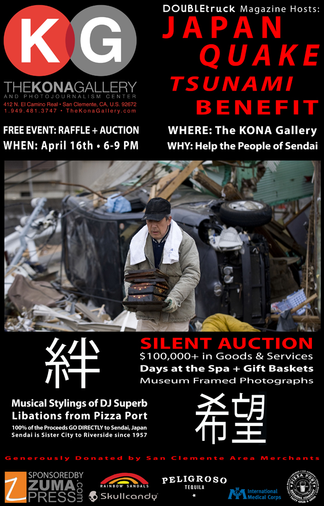 San Clemente, California, U.S. – It has been a month since the devastating 9.0 earthquake and ensuring deadly tsunami hit Japan. The fallout is still being felt worldwide. On Saturday, April 16th from 6pm till 9pm, come to The KONA Gallery at 412 North El Camino Real, San Clemente, U.S. to be apart of a silent auction / raffle and general event to benefit the victims. ZUMA Press has teamed up with DOUBLEtruck Magazine and the KONA Gallery and Photojournalism Workshop Center to throw a benefit for the victims. Donating over $66,000 worth of museum mounted award winning pictures. Local merchants ponied up big time. They all have been very generous as well, donating thousands of dollars worth of gift baskets and certificates for services. Also donating libations and food for the event itself. If you can not attend in person, feel free to send a check donations to the gallery send put in memo Japan Quake Benefit. 100% of the proceeds will go to Japan, through International Medical Corps and ZUMA Press’s Tokyo Bureau.