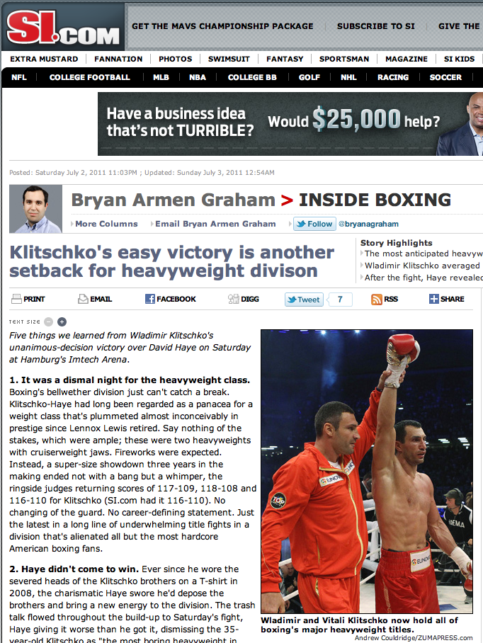 Boxing Title Bout – ZUMA Champ on SI.com Posted by ZUMAPRESS.com on July 3, 2011 Posted in: ZUMALAND. Tagged: boxing, fight, Illustrated, press, Sports, ZUMA. Leave a comment July 2, 2011 – Hamburg, Germany – World Heavyweight Title Boxing Match: Klitschko easily beats Hayes. ZUMA’s ‘winning’ coverage, scores a knock out on SI.com. ZUMA Wire Service photo by Andrew Couldridge via Action Images captured all the action and the winning moment. For the best moments go to ZUMA24.com. Share this: Click to share on Facebook (Opens in new window) Facebook Click to share on LinkedIn (Opens in new window) LinkedIn Click to share on X (Opens in new window) X Like Loading... Related Posts navigation ← COLLAPSE OF CHINA MINE…..Tearsheet WSJ.com EX LEADER’S PARTY WINS ELECTION….WSJ.com →