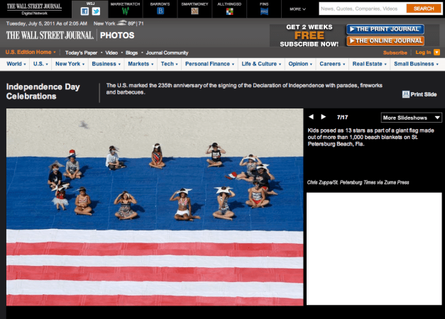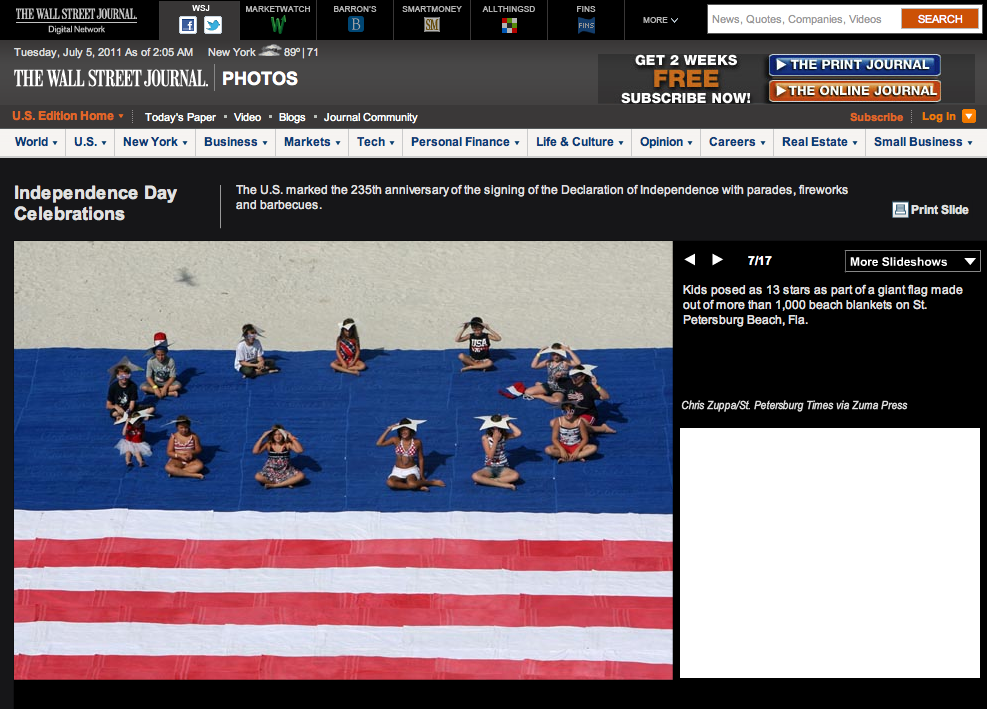 A LOOK AT THE CELEBRATION….Tearsheet WSJ.com Posted by ZUMAPRESS.com on July 5, 2011 Posted in: ZUMALAND. Leave a comment The Wall Street Journal Online Independence Day Celebration Photos ©Chris Zuppa/St. Petersburg Times via ZUMAPRESS.com View More Photos Share this: Click to share on Facebook (Opens in new window) Facebook Click to share on LinkedIn (Opens in new window) LinkedIn Click to share on X (Opens in new window) X Like Loading... Related Posts navigation ← Montana’s Yellowstone River Oil Spill……Deadline ASAP! SHUTDOWN…..Tearsheet WSJ.com →