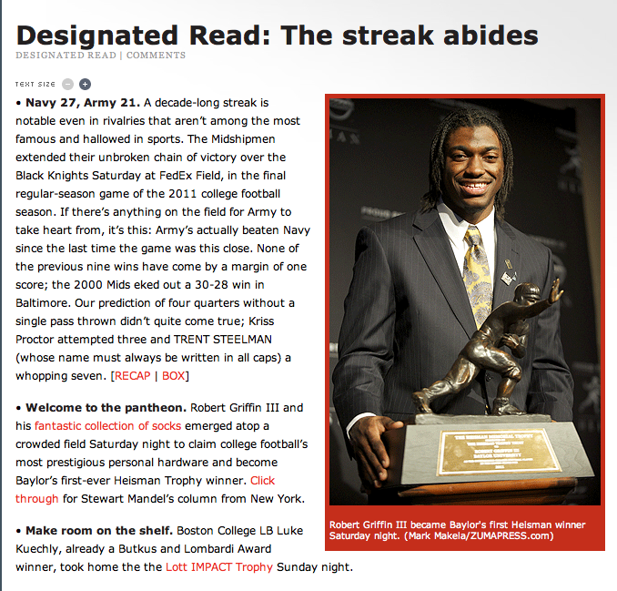 Heisman Sports Illustrated tearsheet. Posted by ZUMAPRESS.com on December 13, 2011 Posted in: ZUMALAND. Leave a comment © Mark Makela/ZUMAPRESS.com Share this: Share on Facebook (Opens in new window) Facebook Share on LinkedIn (Opens in new window) LinkedIn Share on X (Opens in new window) X Like Loading... Related Posts navigation ← Meet Josh Edelson, New ZUMA Photographer! Mother Jones Tearsheet. →