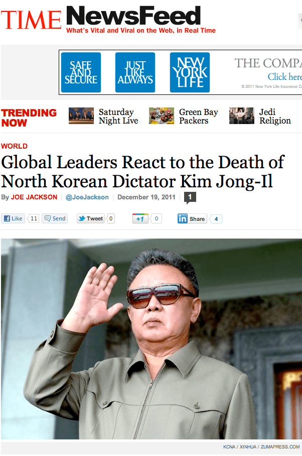 TIME.com – Tearsheet. Posted by ZUMAPRESS.com on December 19, 2011 Posted in: ZUMALAND. Leave a comment © KCNA / XINHUA / ZUMAPRESS.COM Share this: Share on Facebook (Opens in new window) Facebook Share on LinkedIn (Opens in new window) LinkedIn Share on X (Opens in new window) X Like Loading... Related Posts navigation ← TIME.com, Tearsheet. Mother Jones Tearsheet. →