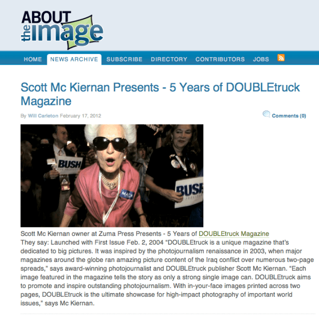 Scott Mc Kiernan Presents – 5 Years of DOUBLEtruck Magazine – ALL ABOUT THE IMAGE Posted by ZUMAPRESS.com on February 17, 2012 Posted in: ZUMALAND. Leave a comment Scott Mc Kiernan Presents – 5 Years of DOUBLEtruck Magazine http://www.doubletruckmagazine.com/ Share this: Share on Facebook (Opens in new window) Facebook Share on LinkedIn (Opens in new window) LinkedIn Share on X (Opens in new window) X Like Loading... Related Posts navigation ← Charles Anthony – Request Beautiful women – Request →