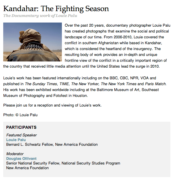 Louie Palu Event at The New America Foundation Posted by ZUMAPRESS.com on June 5, 2012 Posted in: ZUMALAND. Leave a comment EVENT TIME AND LOCATION Monday, June 11, 2012 – 5:00pm – 7:00pm New America Foundation 1899 L Street NW Suite 400 Washington, DC 20036 Share this: Share on Facebook (Opens in new window) Facebook Share on LinkedIn (Opens in new window) LinkedIn Share on X (Opens in new window) X Like Loading... Related Posts navigation ← MTV Awards – Request The Week – Tear sheets →