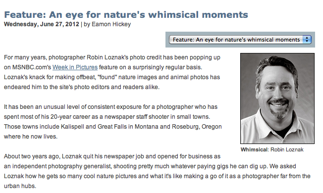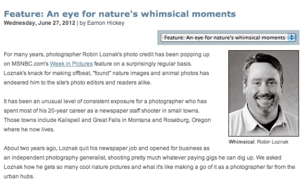 ZUMA’s own Robin Loznak, famed for his nature photography and more. Posted by ZUMAPRESS.com on July 6, 2012 Posted in: ZUMALAND. Leave a comment Share this: Share on Facebook (Opens in new window) Facebook Share on LinkedIn (Opens in new window) LinkedIn Share on X (Opens in new window) X Like Loading... Related Posts navigation ← Thet Htoo, TIME.com – Tearsheet Princess Anne, Olympics – Request →