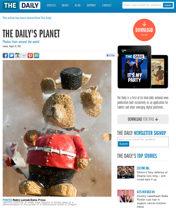 The Daily – Tearsheet Posted by ZUMAPRESS.com on September 6, 2012 Posted in: ZUMALAND. Leave a comment Robin Loznak/ZUMAPRESS.com Share this: Share on Facebook (Opens in new window) Facebook Share on LinkedIn (Opens in new window) LinkedIn Share on X (Opens in new window) X Like Loading... Related Posts navigation ← Mother Jones – Tearsheet National Geographic – Tearsheet →