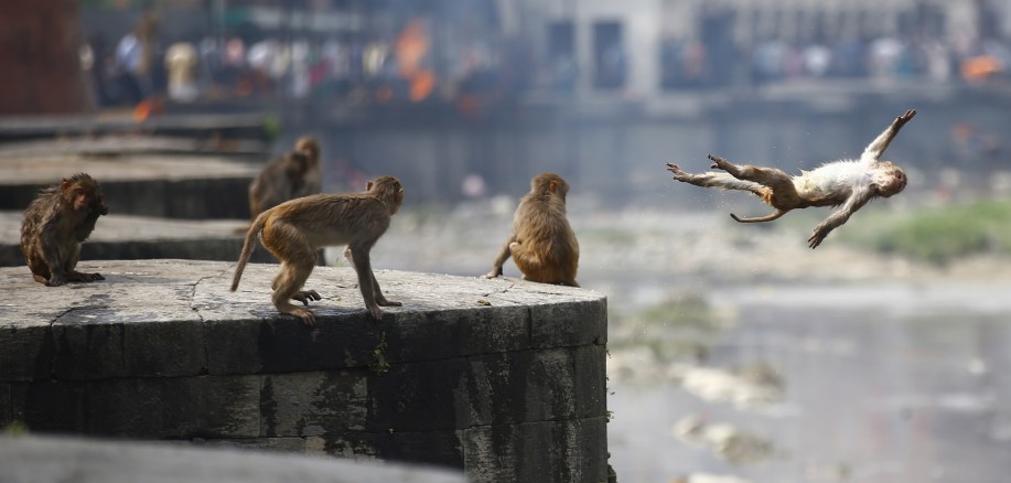 May 26, 2018 – Kathmandu, Nepal – A monkey dives off a high wall on a hot day at Bagmati River inside Pashupathinath Temple in Kathmandu, Nepal. (Credit Image: © Skanda Gautam/ZUMA Wire)