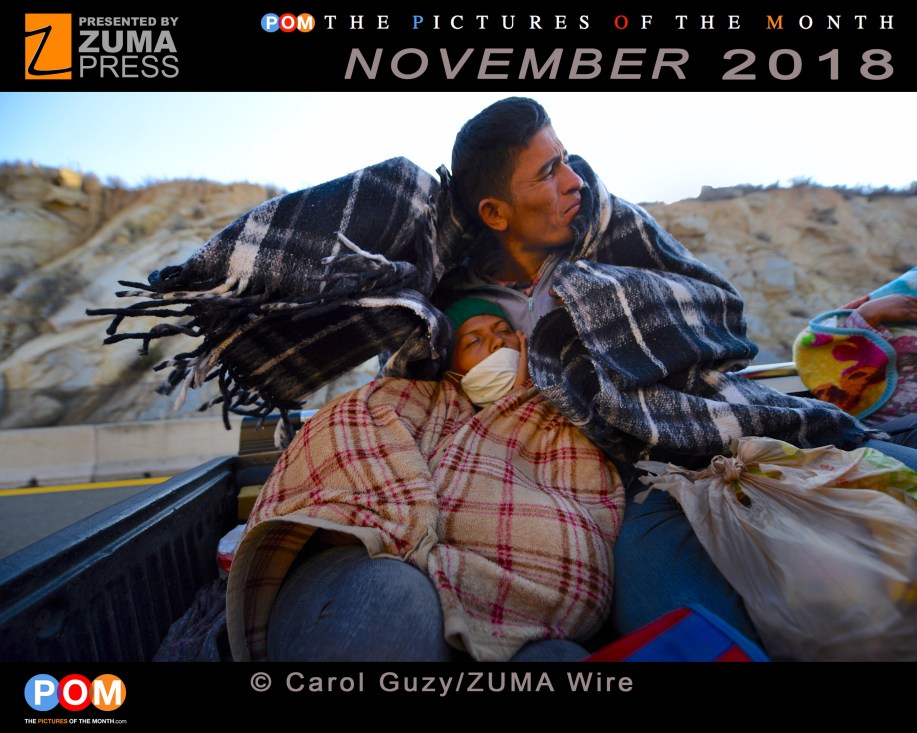 November 20, 2018 – Mexicali, Mexico – JONATAN MATAMOROS, 36 and his wife SARA ARTIAGA, 31 with their infant son JOE MIGUEL ARTIAGA, 18 months old from Honduras, hitch a ride with others from migrant caravan that had stopped to rest in Mexicali, Mexico. They endure the cold wind as they drove through La Rumorosa mountain road to a shelter in Tijuana where they will wait in hopes of crossing the border to America. They started October 12 on their journey with caravan. (Credit Image: © Carol Guzy/ZUMA Wire)