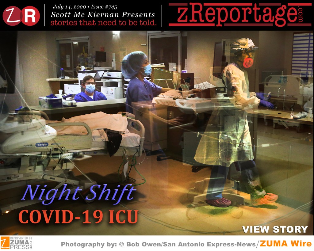 zReportage.com Story of the Week #745: TUESDAY July 14, 2020: NIGHT SHIFT COVID19 ICU, by ZUMA Press Newspaper San Antonio Express-News’s 2015 Pulitzer finalist and recently named 2020 Star Photojournalist of the Year by the Headliners Foundation of Texas, Bob Owen and health and medicine reporter Lauren Caruba recent winner of the the Livingston Award for Young Journalists, together they work on special projects. In this zReportage they spent 18 hours in a Texas COVID-19 ICU ward. Alarms were blaring in the COVID-19 intensive care unit. A patient suddenly had awakened in the dark. A breathing tube was threaded down her throat. It was a few minutes before 1 a.m., and her sedatives had worn off. In her room, behind a wall of windows and a closed glass door, she twisted against the wrist restraint that kept her from dislodging the tube. She bit down on the tube and tried to lift her arm. If she pulled out the tube, she could die. Welcome to: Night Shift COVID-19 ICU