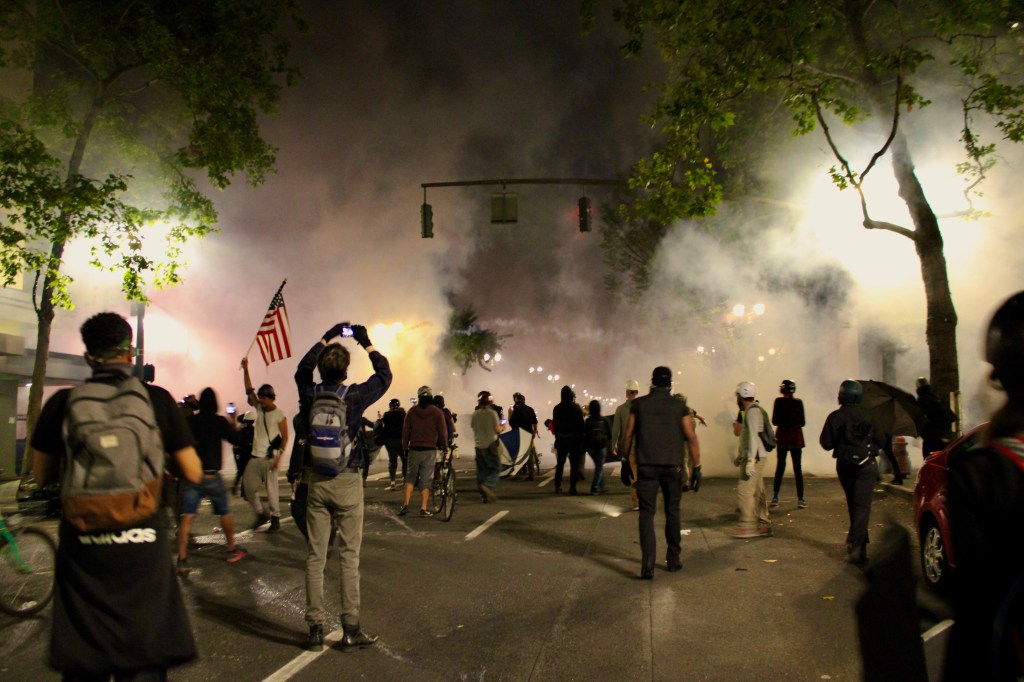 July 22, 2020: Portland OR: Federal officers, wearing camouflage and tactical gear, fire tear gas and and other munitions to disperse the crowd of protesters. Federal officers were deployed to Portland to quell unrest and protect federal property as demonstrations have escalated in recent months.