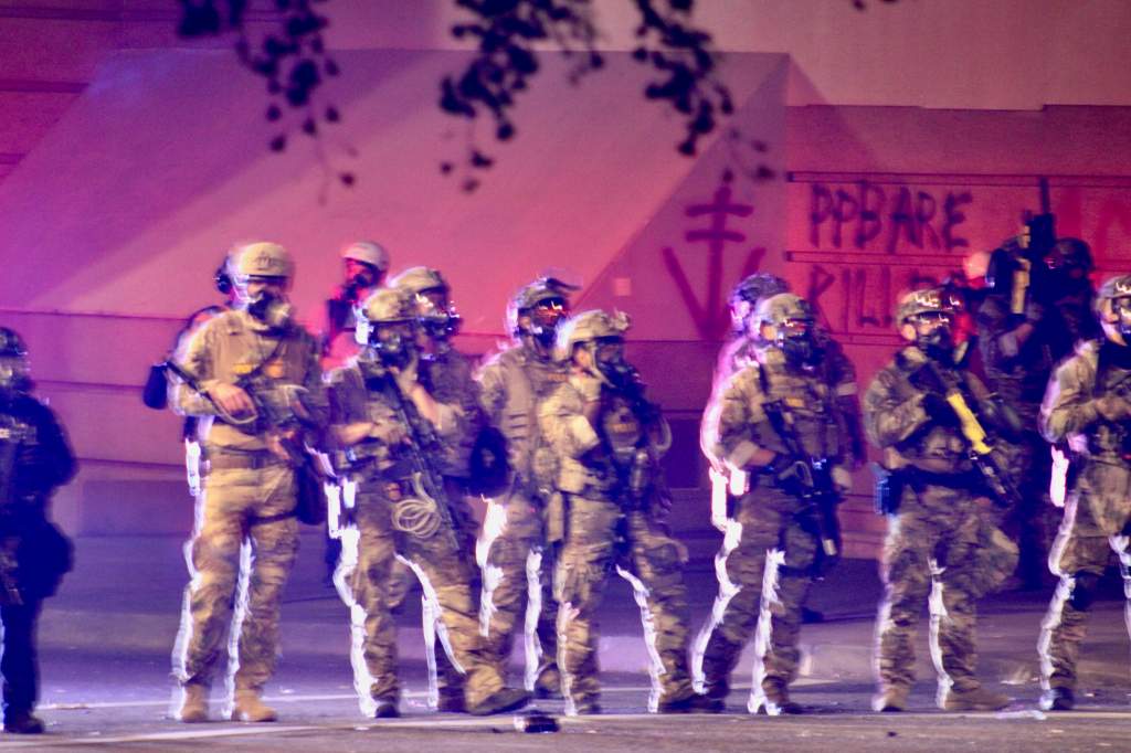 Protestors light some trash on fire at the door to the courthouse, behind which reside Federal Agents sent by President Trump stop the Black Lives Matter protests. Other protestors — one who is a US military combat veteran, begins to stamp out the fire. Tear gas begins to pour out from the opening.