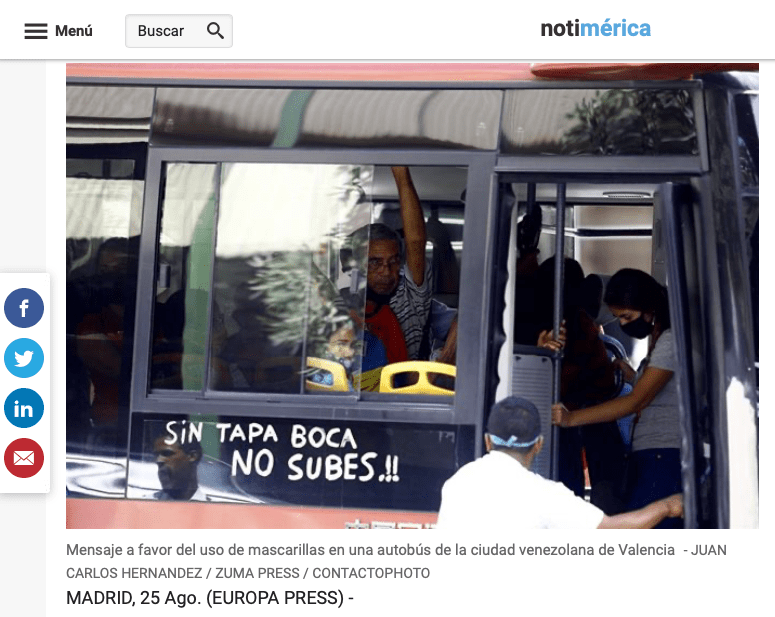 August 24, 2020, Valencia, Carabobo, Venezuela: August 24, 2020. Public transport users do not comply with prevention measures, by not using the mouthpiece during the transfer inside the units. Venezuela handles daily contacts of more than 900 people and surpasses 40 thousand cases of contagion. In Valencia, Carabobo state. Photo: Juan Carlos Hernandez. (Credit Image: © Juan Carlos Hernandez/ZUMA Wire)