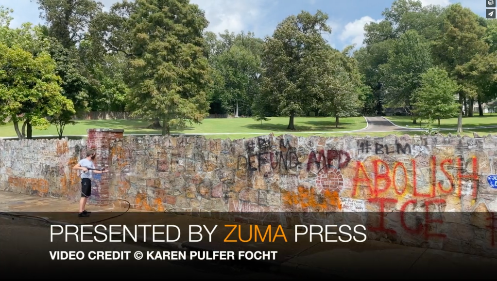 September 1, 2020, Memphis, Tennessee, USA: Workmen clean up GRACELAND, the ELVIS PRESLEY estate, one of the most visited homes in America. The popular tourist site was hit overnight with “Defund the Police” and “BLM” (Black Lives Matter) graffiti. The vandalism was on the wall outside his home in a space used for fans who want to leave messages. Thick black letters on the sidewalk along Elvis Presley Boulevard and other slogans were sprayed on the stone wall in front of the mansion where Elvis lived for 20 years, until his death on Aug. 16, 1977.