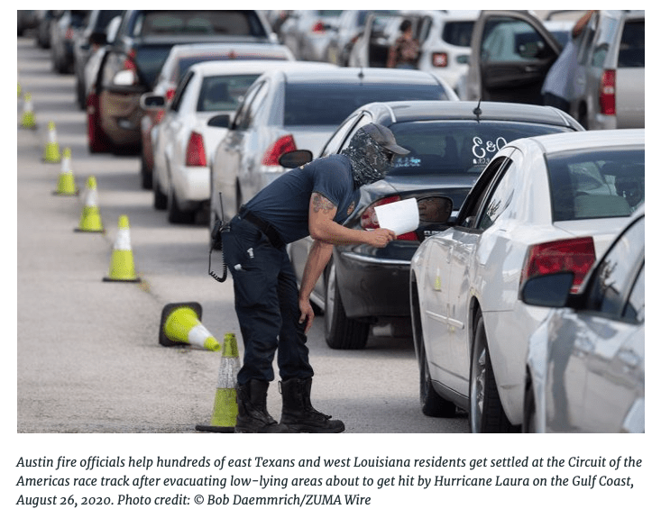 August 26, 2020, Austin, Texas, USA: Austin fire officials help hundreds of east Texans and west Louisiana residents get settled at the Circuit of the Americas race track after evacuating low-lying areas about to get hit by Hurricane Laura on the Gulf Coast. Laura is expected to make landfall overnight as a Category 4 storm and wreak havoc along the Texas coast and inland.