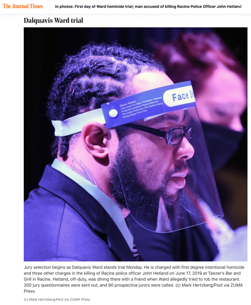 Top court photographer, MARK HERTZBERG, on assignment for ZUMA Wire Service, was pool photographer today for first day of a tragic trial in Racine, WI of an armed robbery of a restaurant gone terribly wrong. An off duty officer was dining and tried to peacefully stop it. Instead, he was shot and killed. ZUMA is very fortunately to have an unparalleled court expert photographer in Mark Hertzberg. Mark, as usual, professionally brought back a aubergiste coverage of a very emotional first day of the Ward homicide trial; man accused of killing Racine Police Officer John Hetland.”