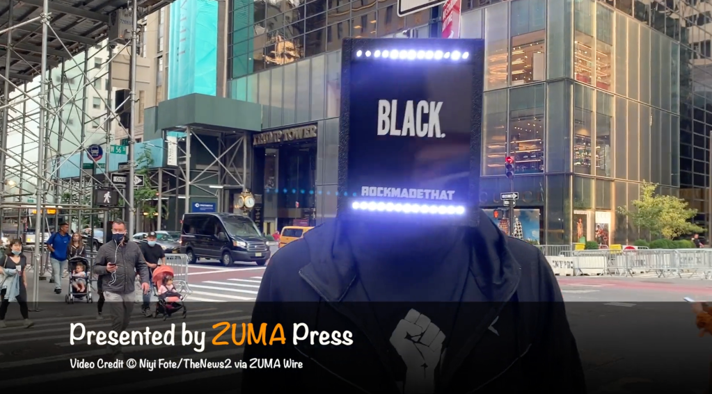 September 15, 2020, New York, USA: A black Lives matter protester dressed up in an all black robotic style protesting against police brutality and social injustice and at the same time celebrating the ongoing New York Fashion Week (NYFW) in front of Trump Tower.