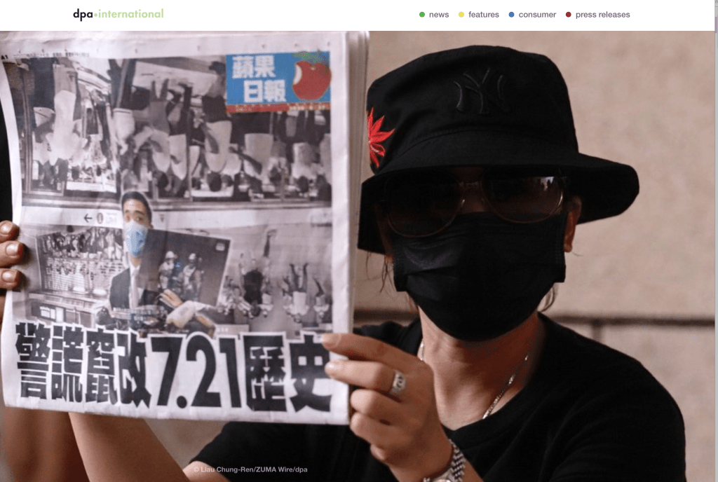 August 27, 2020, Hong Kong, China: Pro-Democracy supporter displays a copy of Apple Daily’s front page titled, ‘Police Lies, Altering The History Of July 21, 2019’ outside the West Kowloon Court. Prominent democrats including Apple Daily’s owner Jimmy Lai have been arrested under the new security law which threatens the freedom of the former British territory.