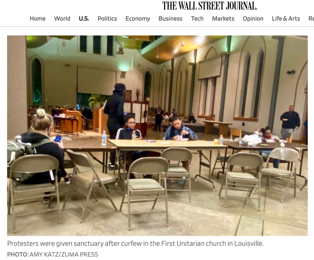 September 24, 2020, Louisville, Kentucky, USA: Louisville, KY tonight shortly after the 9:00pm Curfew. First Unitarian church where the protestors were guaranteed sanctuary by many clergy, but then were virtually held hostage by the Police. Clery finally negotiated their safe exit and return home.