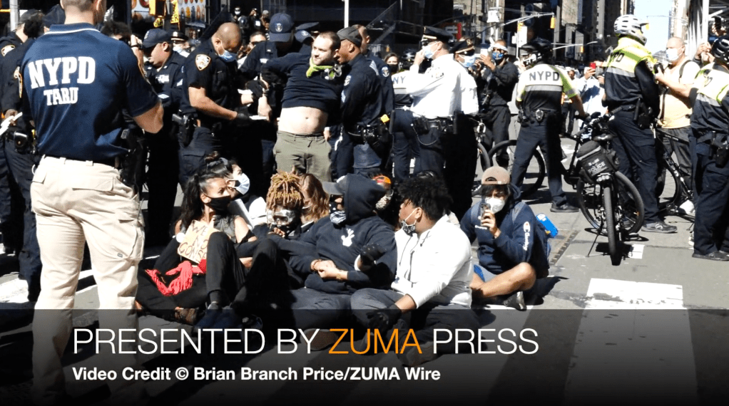 September 19, 2020: Protesters face off with New York City Police officers during a two standoff at Times Square In New York, New York. About 50 demonstrator were arrested while protesting ICE’s (U.S. Immigration and Customs Enforcement) abuse treatment of inmates and detainees by performing hysterectomies on immigrant children.