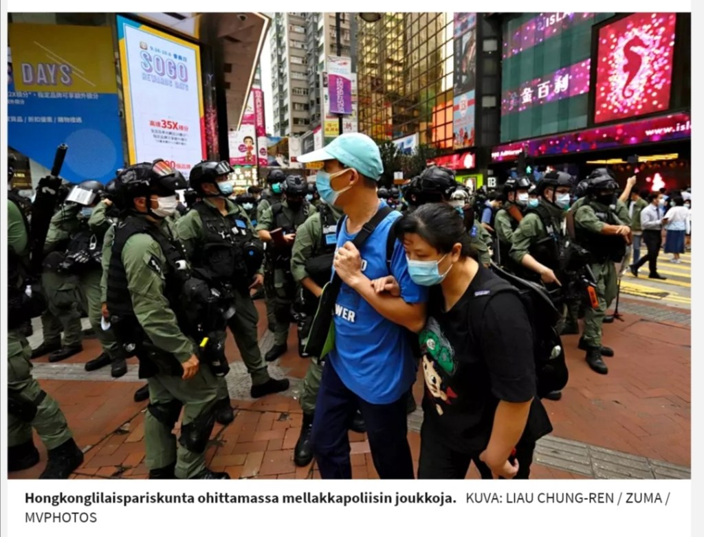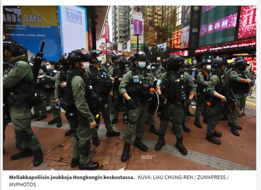 October 1, 2020, Hong Kong, CHINA: Couple walk past Riot Police standing guard in front of department store in Causeway Bay on the PRC National Day. Some 6,000 policemen, which include Riot Police and Special Task Force are mobilized to maintain ‘law and order’ on the PRC National Day in Hong Kong bringing tension over the City.