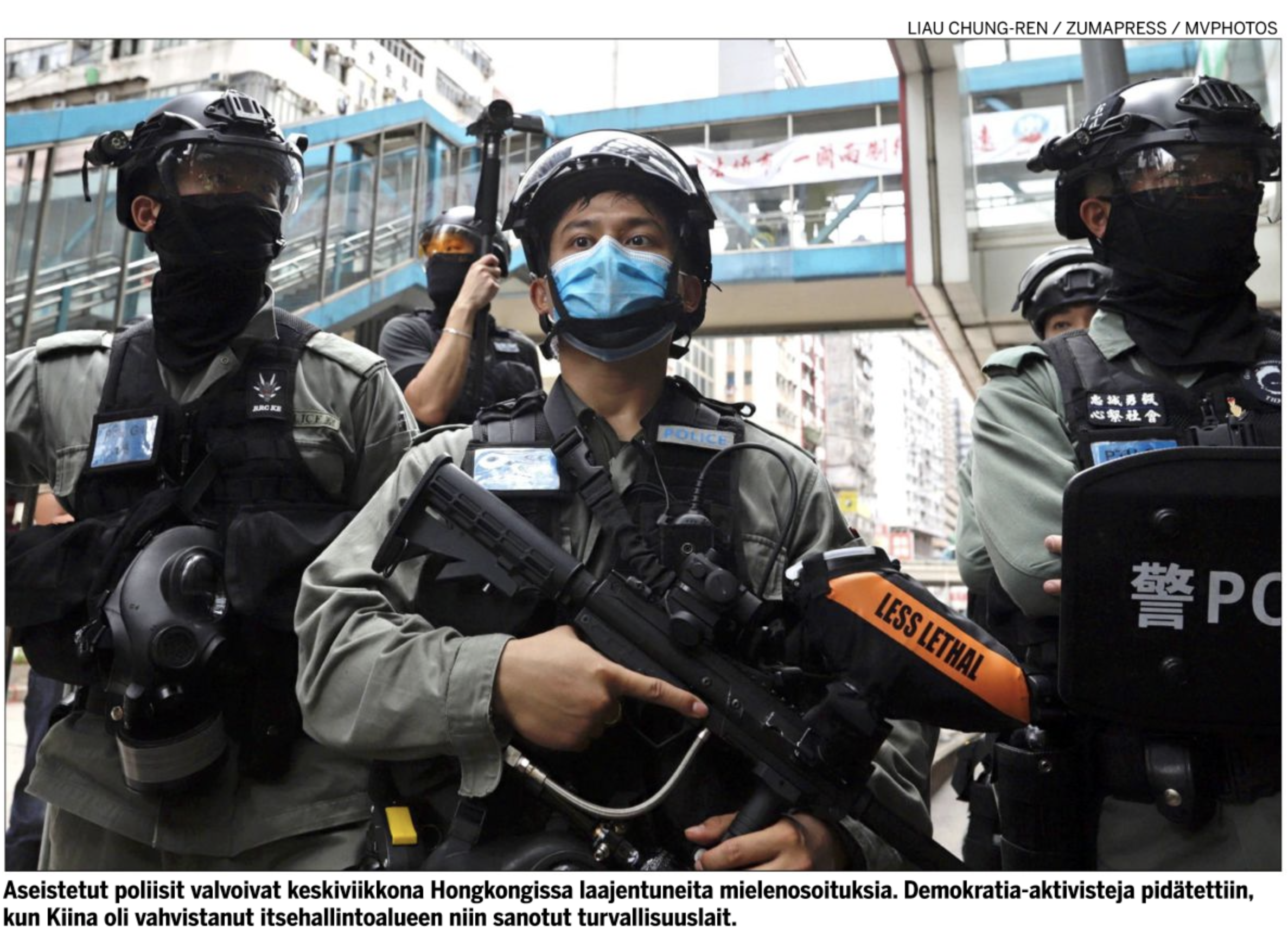 July 1, 2020, Hong Kong, CHINA: Riot Police are being mobilized to stand guard on every strategic point within the City, to stop citizens from gathering and initiating a protest march. Far behind on the flyover is a pro-Beijing political slogan on the banner which reads: ‘support the issuing of National Security Law’.