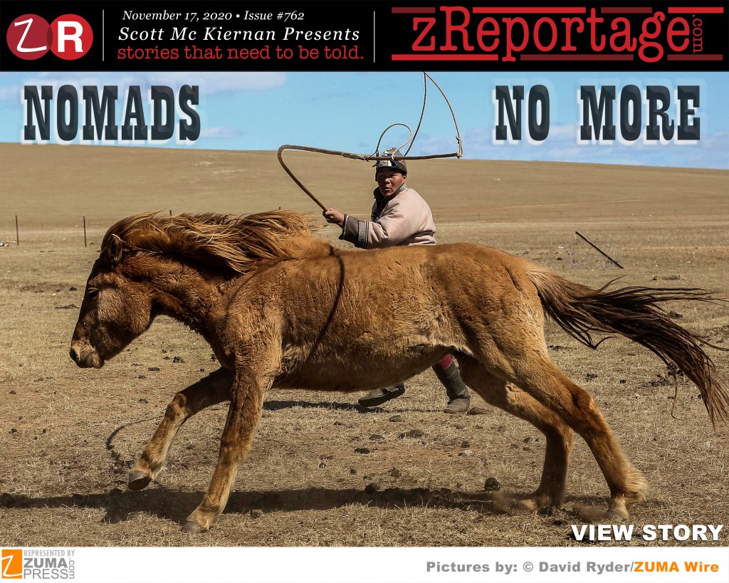 zReportage.com Story of the Week #762: TUESDAY November 17, 2020: ‘NOMADS NO MORE’ from ZUMA Press award winning photographer David Ryder who specializes in in-depth issue reporting: For millennia, pastoral herders have lived on the Mongolian steppe, moving with their livestock according to the seasons. Herding is a way of life for over a third of Mongolians, and of symbolic importance to the whole country. Thanks in part to rural-to-urban migration, it is now under threat. In Mongolia, as in other parts of the world, this century is proving to be an era of fast and furious change. Modernization, a new economic system, opportunities in mining, and the effects of overgrazing and climate change are nudging an ancient nomadic culture to adopt a more urban, settled lifestyle. Nomads now face a choice that will shape the future of their country: withstand new threats on the steppe, or give up herding in search of new opportunities. Welcome to: ‘NOMADS NO MORE’