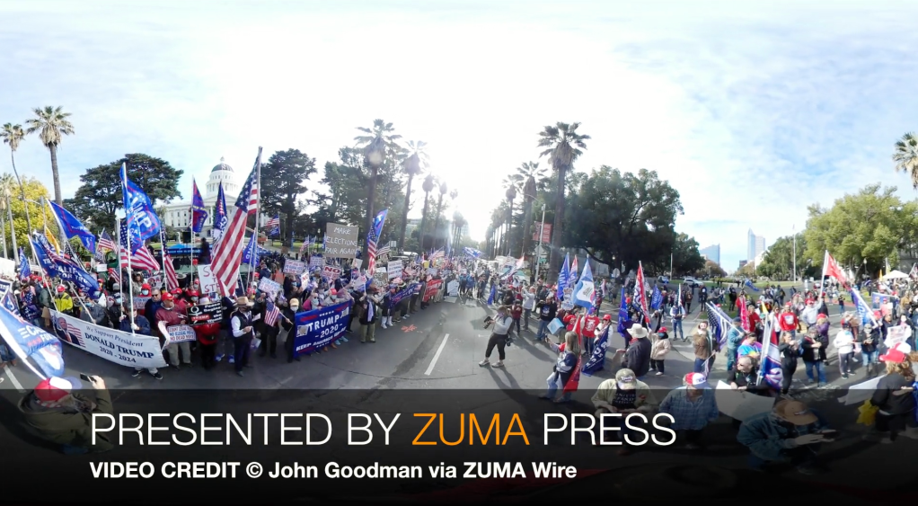 November 14, 2020, Sacramento, California, US: Supporters of President Trump rally on a street corner in front of the California state Capitol building for the nationwide MAGA March. The supporters chanted and yelled Qanon conspiracies at counter protesters to claim the election results were fraudulent.