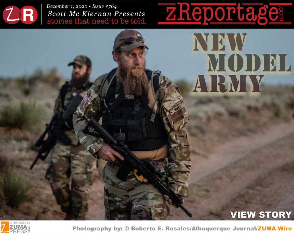 zReportage.com Story of the Week #764: TUESDAY December 1, 2020: ‘NEW MODEL ARMY’ from ZUMA Press award winning Newspaper the Albuquerque Journal photojournalist Roberto E. Rosales and journalist Matthew Reisen: In recent months, private militias across the country have reacted angrily to pandemic lockdown measures, and they have shown up in force at anti-fascist and Black Lives Matter protests. New Mexico has been keeping its eye on unlawful militias, ever since the so-called New Mexico Civil Guard began appearing at demonstrations against police brutality and colonial monuments. In a civil suit aimed at stopping the militia, the state wrote the group ”usurped law enforcement authority,” noting that ”New Mexico law forbids unregulated private security forces and unregulated paramilitary organizations because they are not accountable to the people, they pose a threat to public safety, and they encourage rather than deter or quell violence.” However, there’s no easy solution to the country’s dangerous and growing militia problem. Welcome to: ‘NEW MODEL ARMY’