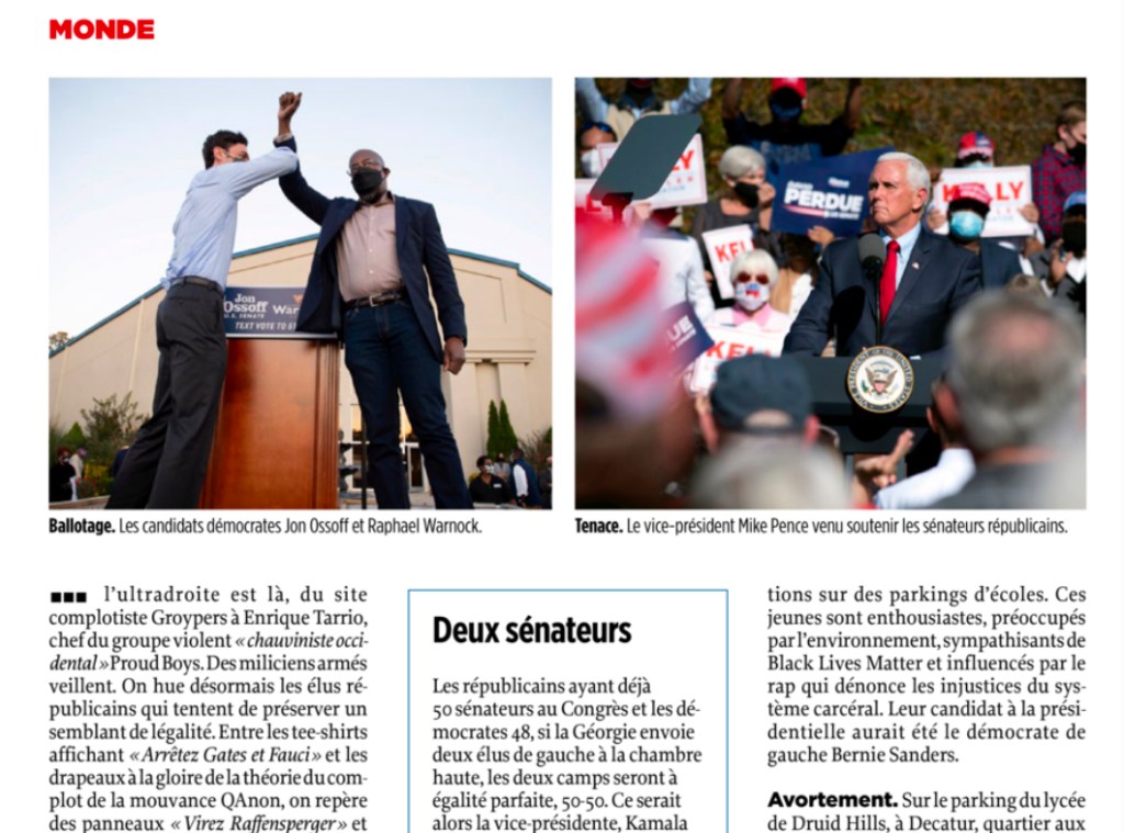 November 19, 2020, Jonesboro, Georgia, USA: Democratic candidate L-R: JON OSSOFF, 33 elbow bumps REVEREND RAPHAEL GAMALIE WARNOCK, 51, on stage, at their rally of a few dozen supporters, in Clayton County, Georgia, which has a majority of black residents. Ossoff faces incumbent Republican Senator Perdue in a January 5, 2021 special run-off election. Meanwhile fellow Democrat Warnock is running against Republican incumbent Senator Loeffler. Republicans need one victory to retain their U.S. Senate majority.