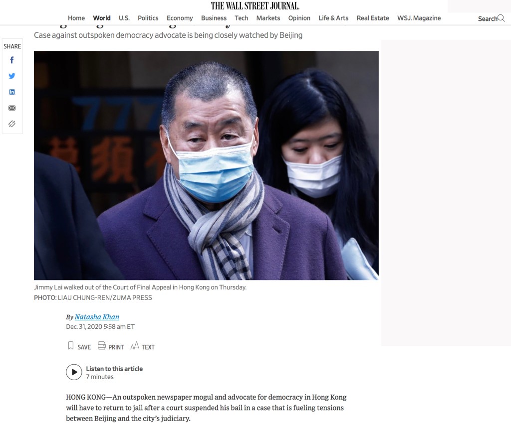 December 31, 2020, Hong Kong, CHINA: JIMMY LAI (73) Hong Kong media tycoon and strong advocate for democracy, founder of NEXT MEDIA (Next Digital) and APPLE DAILY walks out from Court of Final Appeal accompanied by his daughter (right) after attending a court hearing on re-assessment of Lai’s bail term.