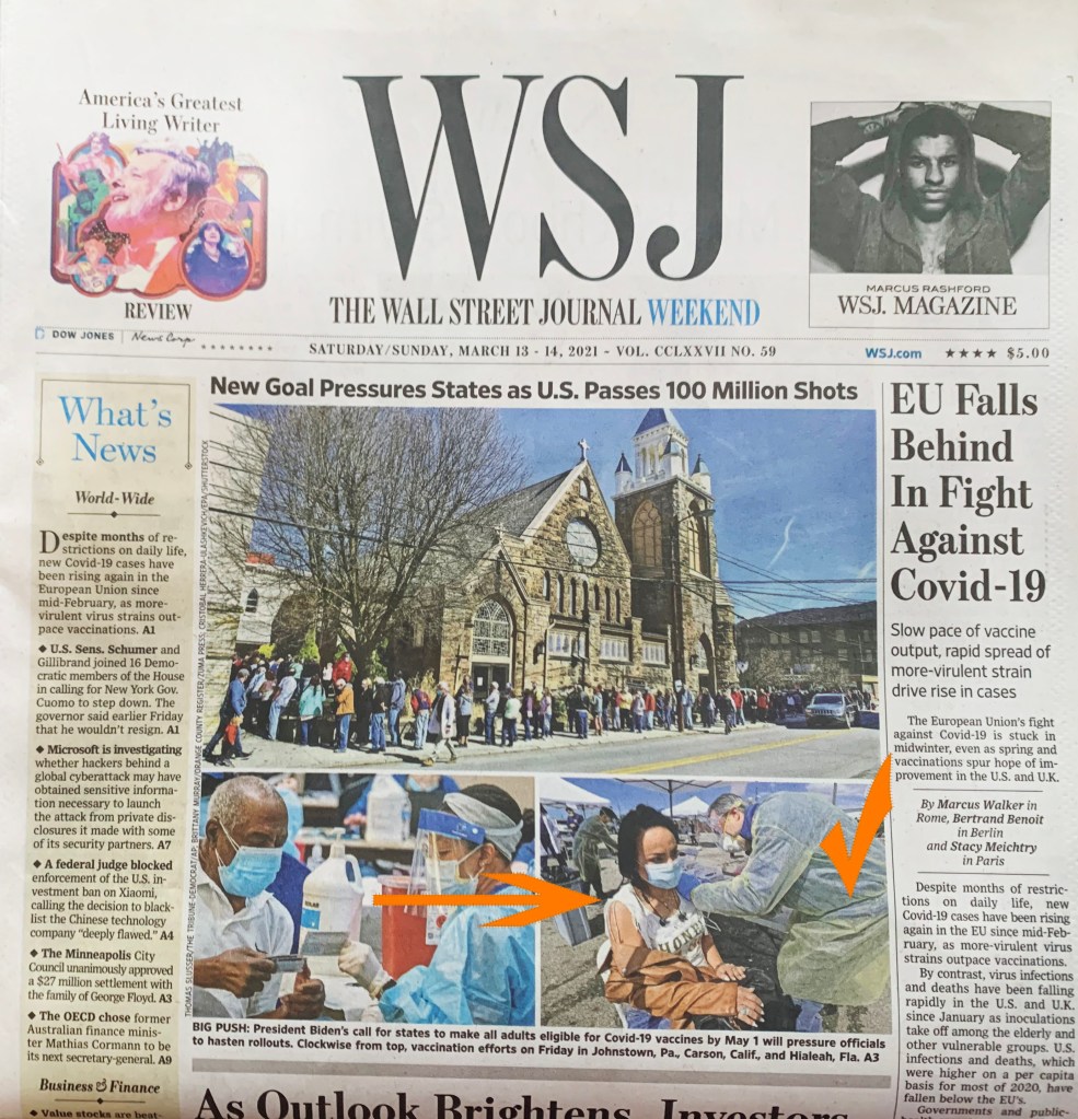 March 12, 2021, Carson, California, USA: KITSIA P. GUARDADO teared up with emotion as she received her COVID-19 vaccine from Dr. LUCAS RESTREPO. Guardado was able to start her own trucking business with extended time away from her children because she had a nanny willing to support her efforts. Her nanny and friend of 22 years passed away after contracting the virus so the tears were for her and the other family and friends who have battled tragedy this past year. The International Brotherhood of Teamsters along with Northeast Community Clinic and support from local politicians were able to set up the clinic at Shippers Transport Express.