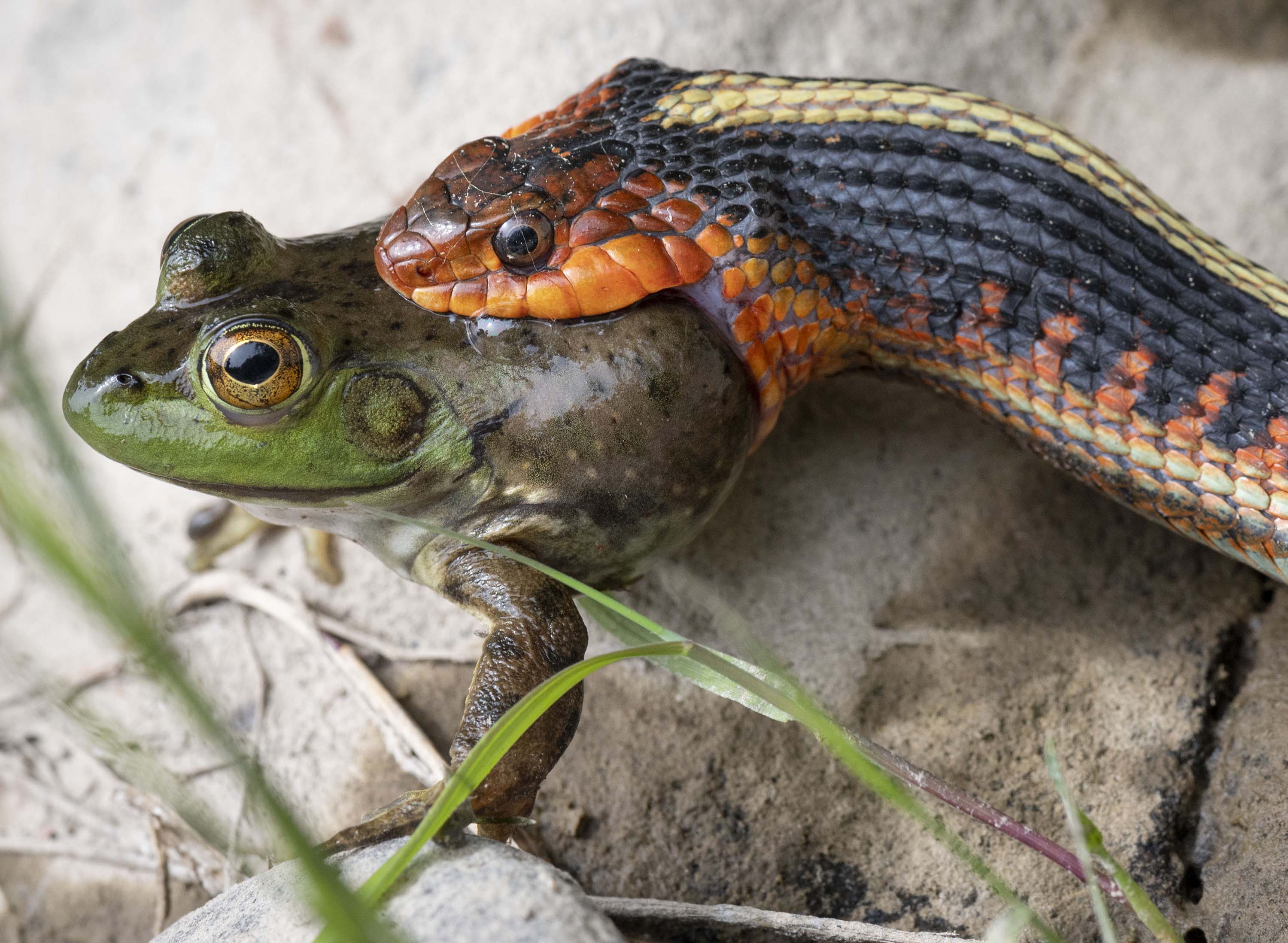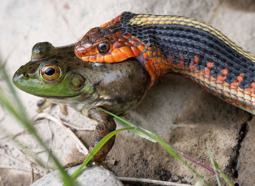 WWE RUMBLE IN GARDEN: May 25, 2020, Elkton, Oregon, USA: A wild garter snake captures and eats a bullfrog on the bank of the Umpqua River near Elkton in rural Douglas County, Oregon. According to the Oregon Department of Fish and Wildlife garter snakes are known to eat frogs, toads, salamanders, birds, fish, reptiles, and small mammals. (Credit Image: © Robin Loznak/ZUMA Wire)