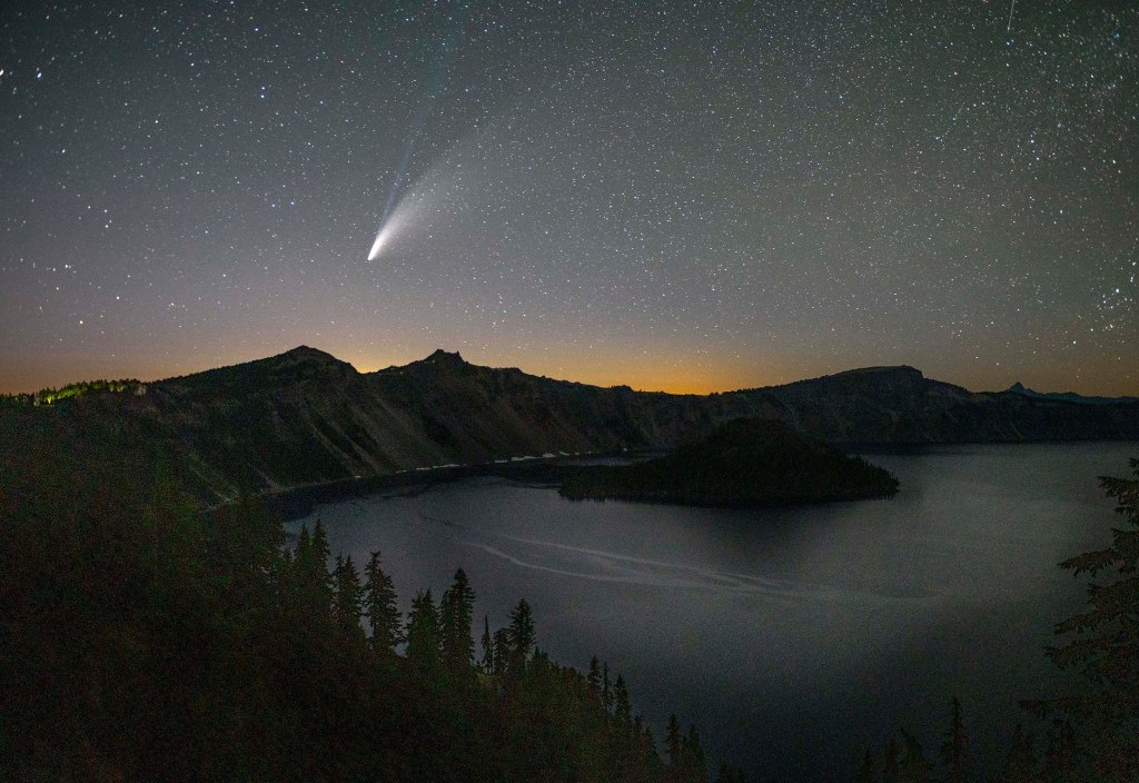 HEAVENLY BODIES: July 16, 2020, Crater Lake National Park, Oregon, USA: Retrograde comet NEOWISE (C/2020 F3) NASA discovered March 27, 2020. Passing by Earth on 6,766 year orbital trip, seen over Crater Lake in Oregon’s Crater Lake National Park. The lake is 1,949 feet (594 m) deep at its deepest point, which makes it the deepest lake in the United States, the second-deepest in North America. (Credit Image: © Robin Loznak/ZUMA Wire)