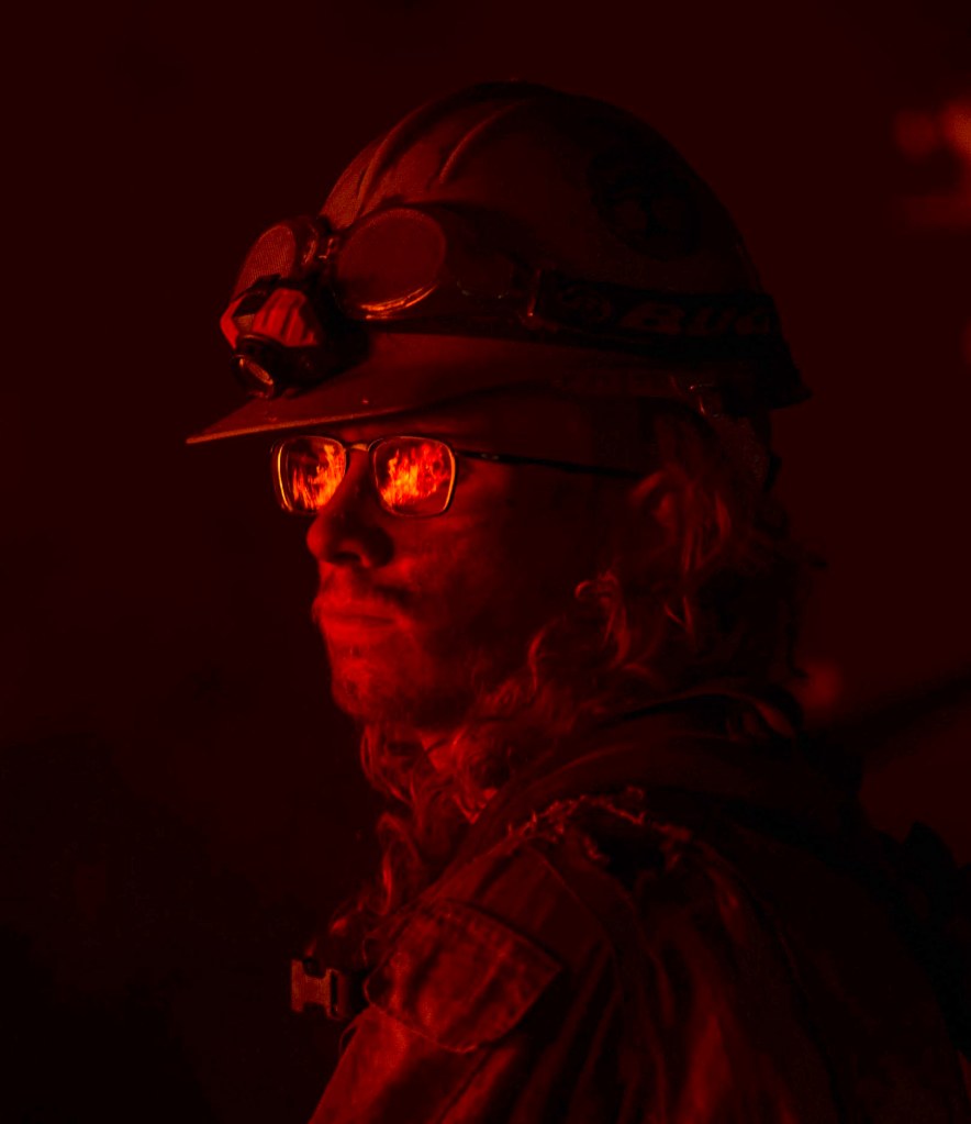 FIRE MAN: September 6, 2020, Yucaipa, California, USA: The El Dorado Fire is reflected in the glasses of an Arroyo Grande Hot Shots firefighter as he watches a backfire burn at Carter Street and Bears Den Ranch Road in Yucaipa on Sunday. (Credit Image: © Terry Pierson/Orange County Register via ZUMA Wire)