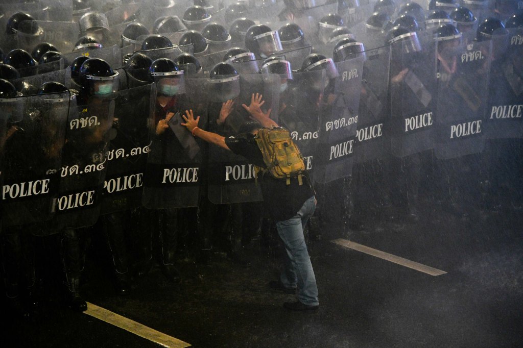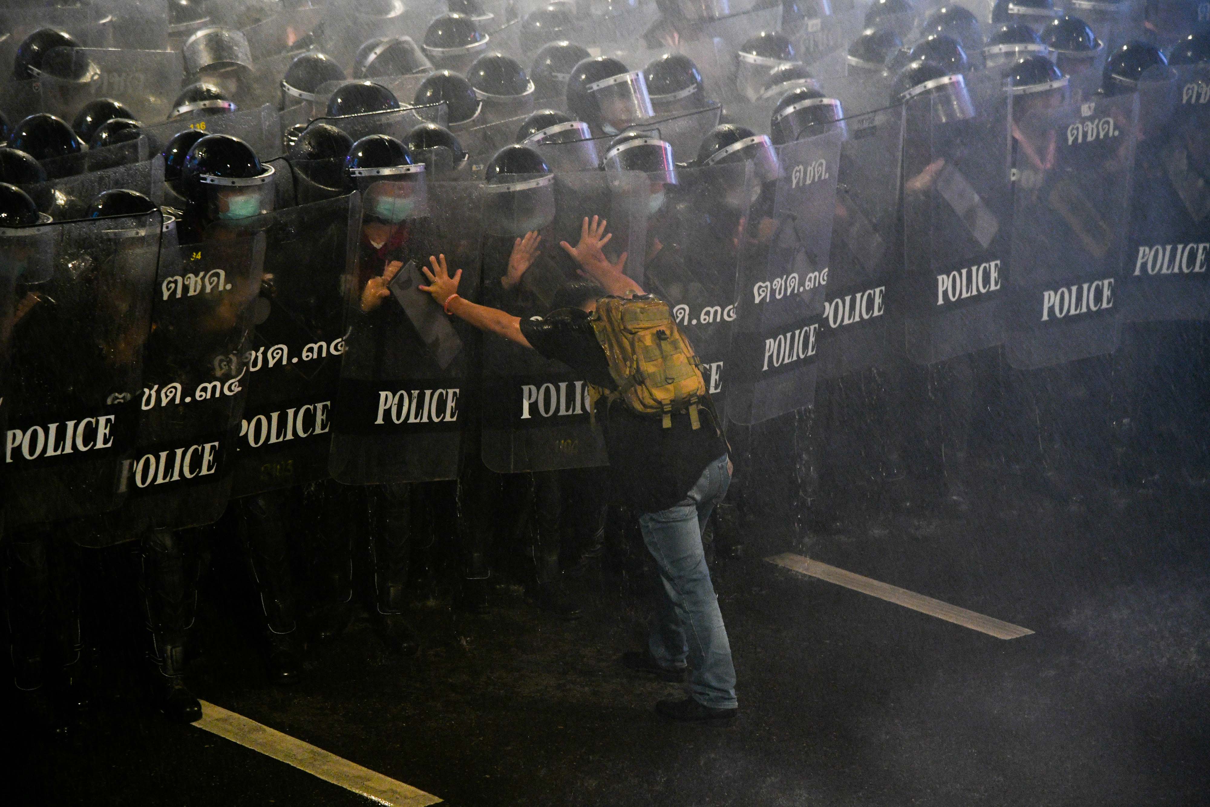 JUST ANOTHER BRICK IN THE WALL: October 16, 2020, Bangkok, Thailand: One man is trying to hold off a battilion of police in full riot gear. As water mist fills the air, from police using water cannons to disperse pro-democracy protesters during an anti-government rally in Bangkok. Pro-democracy protesters take part in a rally against the royalist elite and the military-backed government calling for political and monarchy reforms. (Credit Image: © Vichan Poti/Pacific Press via ZUMA Wire)