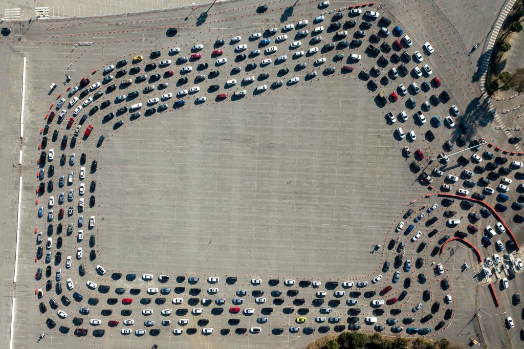 MUSICAL CARS: January 4, 2021, Los Angeles, California, USA: Motorists wait in long lines to take a coronavirus test in a parking lot at Dodger Stadium. The test site is the biggest in the United States and has tested more than a million people since it opened at the beginning of the pandemic. Los Angeles and Southern California are at the epicenter of the biggest surge of people infected by the virus in the United States. (Credit Image: © Ringo Chiu/ZUMA Wire)