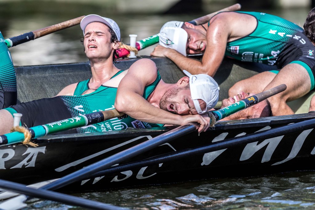 SPENT: July 25, 2020, Bilbao, Spain: The Kaiku Vusa sponsored rowing team collapse exhausted at the finish of their run during the Bandera de Bilbao competition, round seven of Eusko Label Liga 2020 season. They finished tenth or twelve teams. (Credit Image: © Edu Del Fresno/ZUMA Wire)