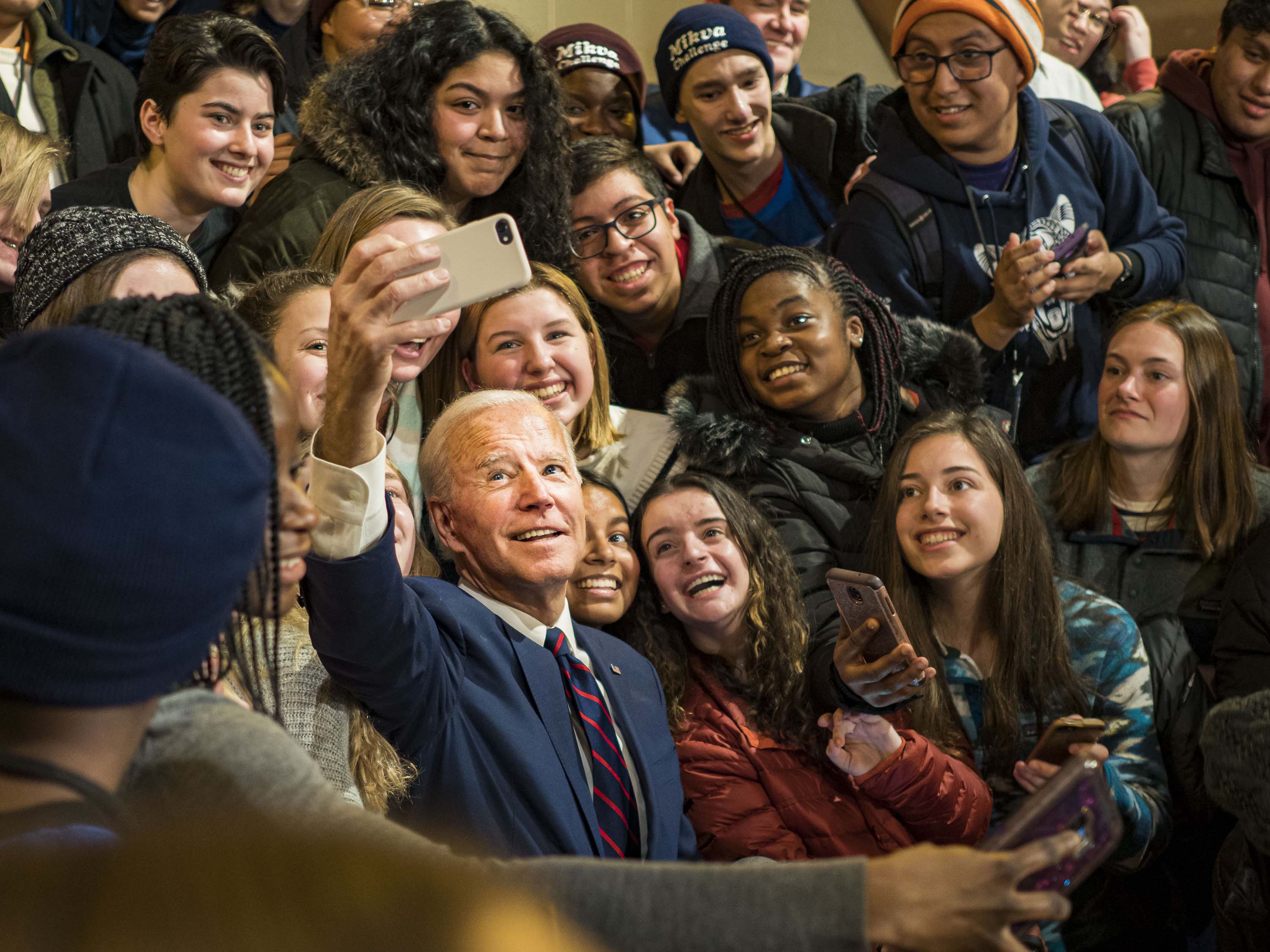 PRESIDENT SELFIE: January 18, 2020, Indianola, Iowa, USA: Former U.S. Vice President JOE BIDEN, candidate for President in Democrat primaries, takes selfies with students after speaking during a campaign event at Simpson College Saturday. About 250 people came to Simpson College to listen to Vice President talk about his reasons for running for President. Iowa hosts the first event of the presidential election cycle. The Iowa Caucuses are in two weeks on February 3rd. (Credit Image: © Jack Kurtz/ZUMA Wire)