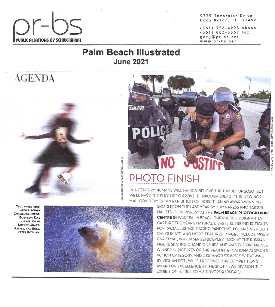 “The New Normal:COVID Times” Exhibition by Award-Winning ZUMA Press Photojournalists Runs May 21-August 14 at the Palm Beach Photographic Center. Posted by ZUMAPRESS.com on June 7, 2021 Posted in: ZUMALAND. Leave a comment Scott Mc Kiernan, Founder & Editor-in-Chief, ZUMA Press Share this: Share on Facebook (Opens in new window) Facebook Share on LinkedIn (Opens in new window) LinkedIn Share on X (Opens in new window) X Like Loading... Related Posts navigation ← Scott Mc Kiernan Presents zReportage.com Story of the Week #788: TUESDAY June 1, 2021: ‘OVER Paradise’ Get a bird’s-eye view of Florida in this amazing series of images from award winning Palm Beach Post Photographer Greg Lovett. ZUMA’s Daniel Ceng Shou-Yi featured on The Guardian.com →