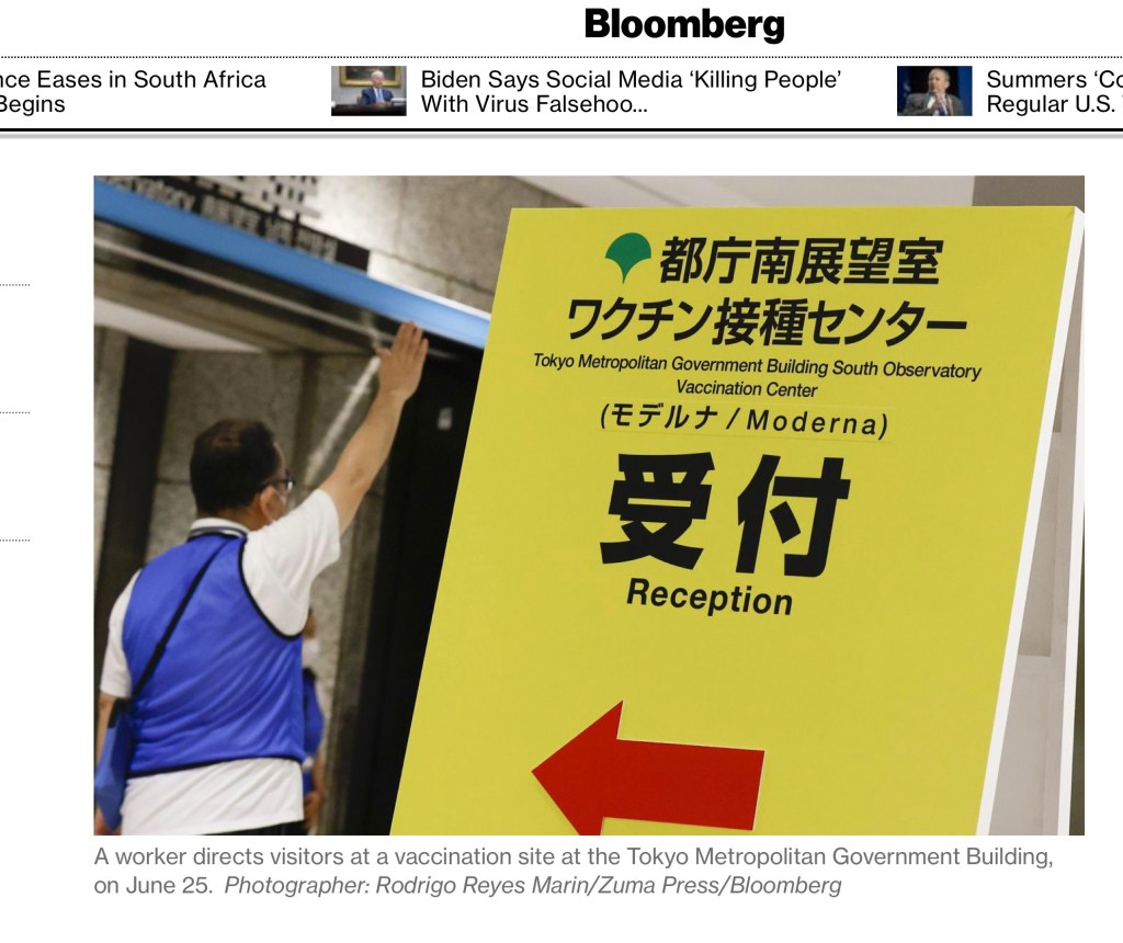 June 25, 2021, Tokyo, Japan: A signboard for the coronavirus vaccination campaign is seen at the Tokyo Metropolitan Government building. People involved in the Tokyo 2020 Olympic and Paralympic Games and residents with inoculation tickets received the Moderna coronavirus vaccines at the Tokyo Metropolitan Government building to boost the inoculation campaign.