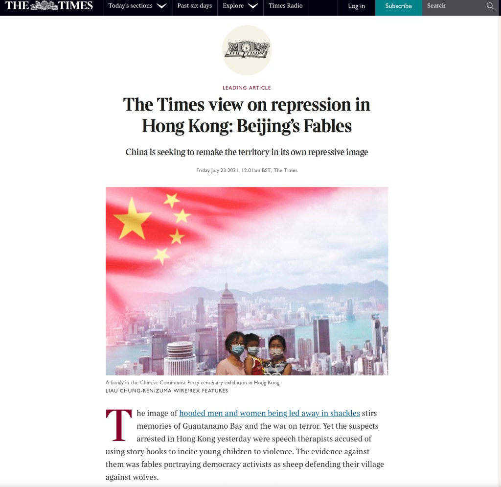 A family pose in front of large screen projecting an image of PRC national flag and panoramic view of Victoria Harbour at the CCP Propaganda Exhibition in Hong Kong praising ‘ scientific achievements ‘ of Chinese Communist Party to celebrate centenary of CCP.