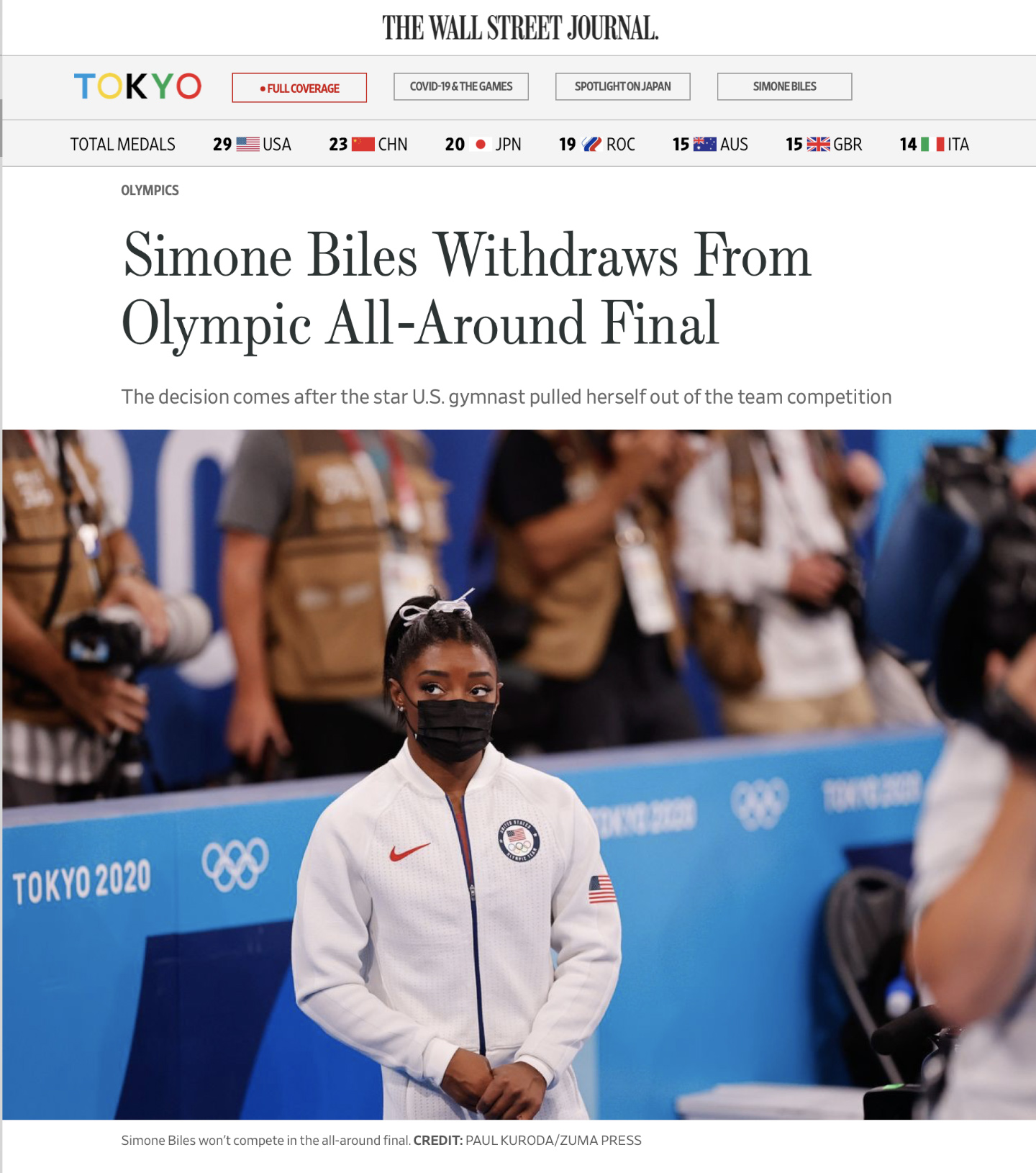 ZUMA’s Paul Kuroda featured on WSJ.com Posted by ZUMAPRESS.com on July 28, 2021 Posted in: ZUMALAND. Leave a comment July 27, 2021, Tokyo, Japan: Simone Biles did not perform after the vault for the U.S.A. women’s gymnastics team in the finals for the Tokyo Olympics 2020. Scott Mc Kiernan, Founder & Editor-in-Chief, ZUMA Press Share this: Share on Facebook (Opens in new window) Facebook Share on LinkedIn (Opens in new window) LinkedIn Share on X (Opens in new window) X Like Loading... Related Posts navigation ← ZUMA’s Mickael Chavet featured in Newspaper ‘Liberation’. ZUMA Makes Cover Of The Wall Street Journal, July 27, 2021 →