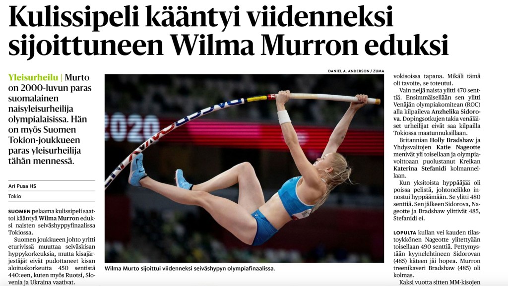 Finland pole vaulter, WILMA MURTO, 23, competes for the Gold medal in Women’s Pole Vaulting at Tokyo Olympic Stadium during the 2020 Tokyo Summer Olympics. Pole Vault Final at the Tokyo Olympic Stadium during the Tokyo 2020 Olympic games.