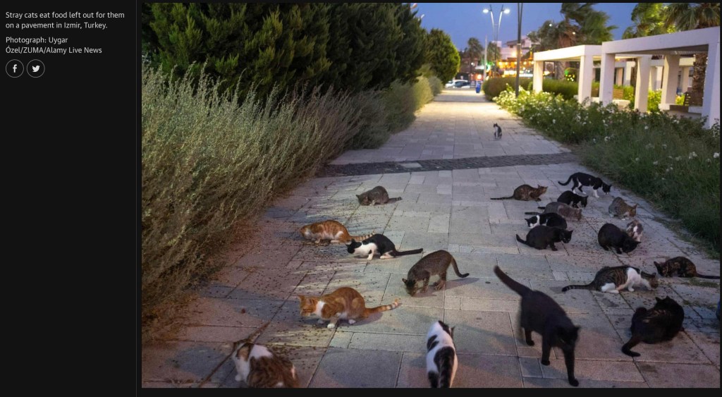 August 13, 2021, Izmir, Izmir, Turkey: Stray cats eating their meals in a pedestrian walkway. Many people feeding stray animal regularly in the street in Izmir-Turkey.