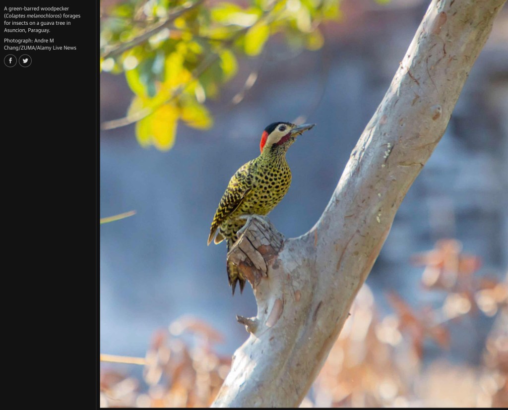 August 15, 2021, Asuncion, Paraguay: A green-barred woodpecker (Colaptes melanochloros) forages for insects on a guava tree during sunny day.