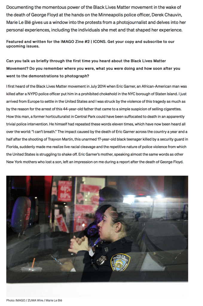 An Interview with ZUMA Photographer Marie Le Blé,a photojournalist documenting the Black Lives Matter movement throughout 2020 and 2021. Posted by ZUMAPRESS.com on August 31, 2021 Posted in: ZUMALAND. Leave a comment Scott Mc Kiernan, Founder & Editor-in-Chief, ZUMA Press Share this: Share on Facebook (Opens in new window) Facebook Share on LinkedIn (Opens in new window) LinkedIn Share on X (Opens in new window) X Like Loading... Related Posts navigation ← ZUMA’s Edna Leshowitz featured on The Highlands Current.org ZUMA’s Marie Le Blé featured on Our Time Press.com →
